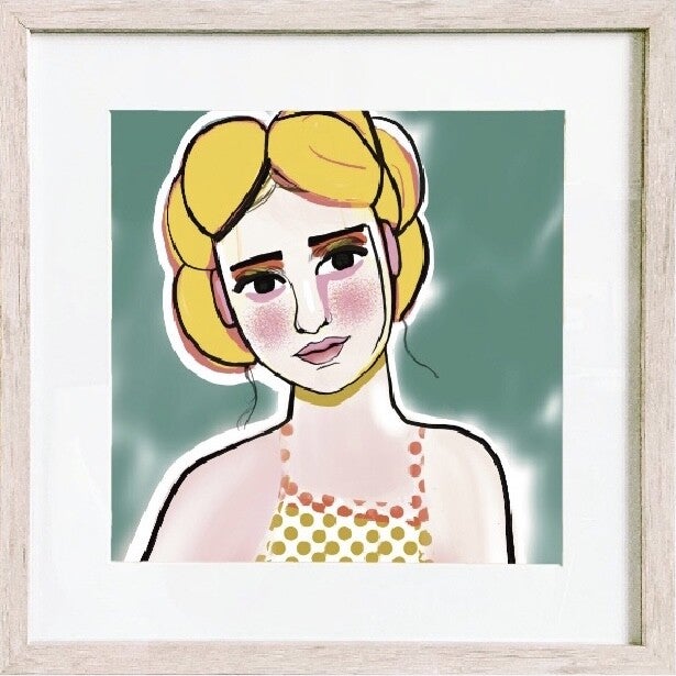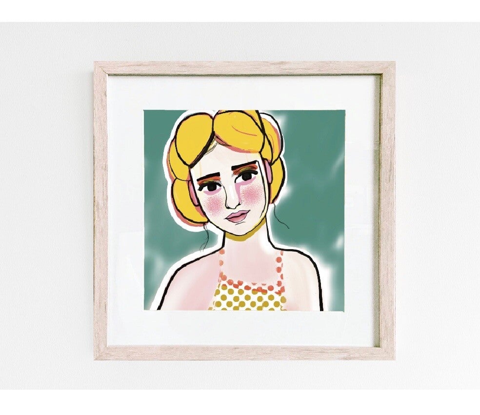 Poster fits nicely with passe-partout in wooden frame in beige color.