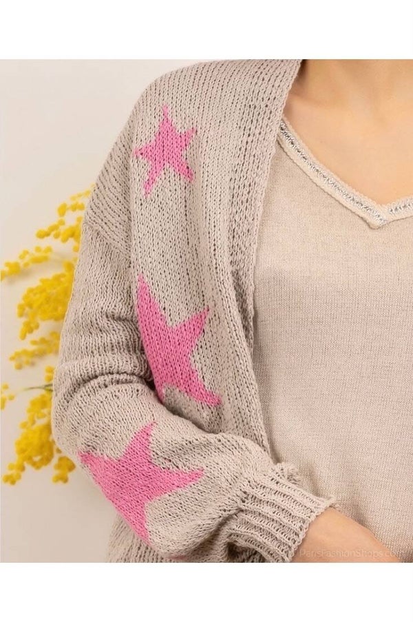 Vest met lange mouwen. Sterren in een andere kleur gebreid aan de voorkant, de achterkant is effen. 2 zakken aan de voorkant.