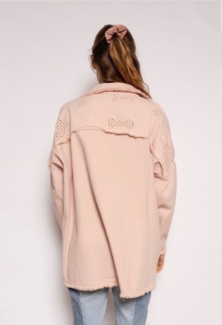 Effen oversized jack van katoen met knopen. Fancy ritsen aan de voorkant en fancy bloemenpatroon.