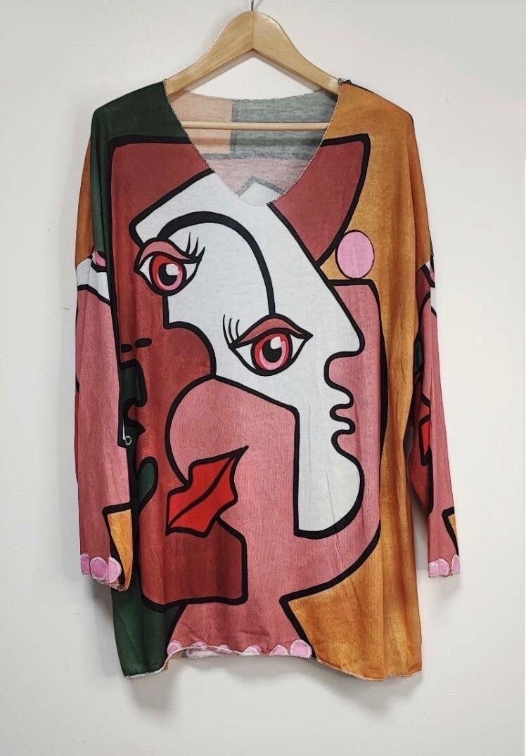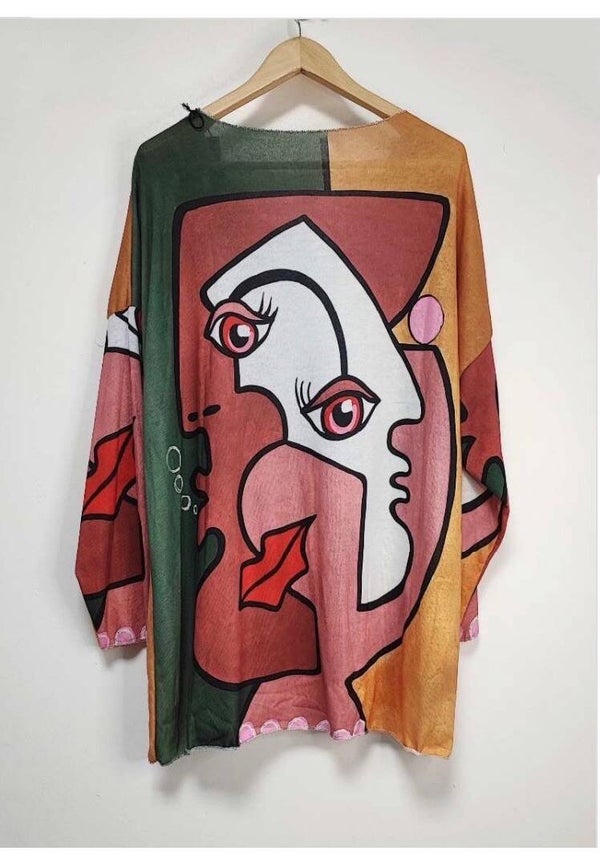 Trui met print van licht breisel, zeer losse pasvorm, ronde hals, lange en wijde mouwen. Afgewerkte randen met zilver lurex draad. Lengte: 75cm.