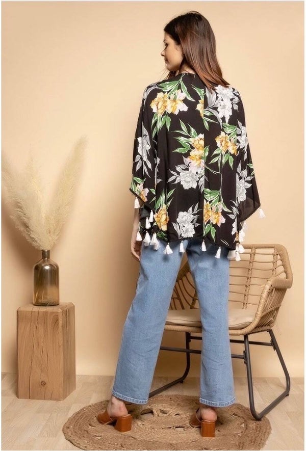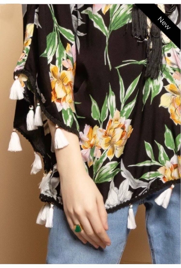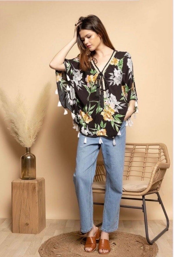 Top in poncho-stijl, met print, V-hals, fancy details met kraag aan de voorkant, wijde mouwen en kanten bies. Lengte: 70cm.